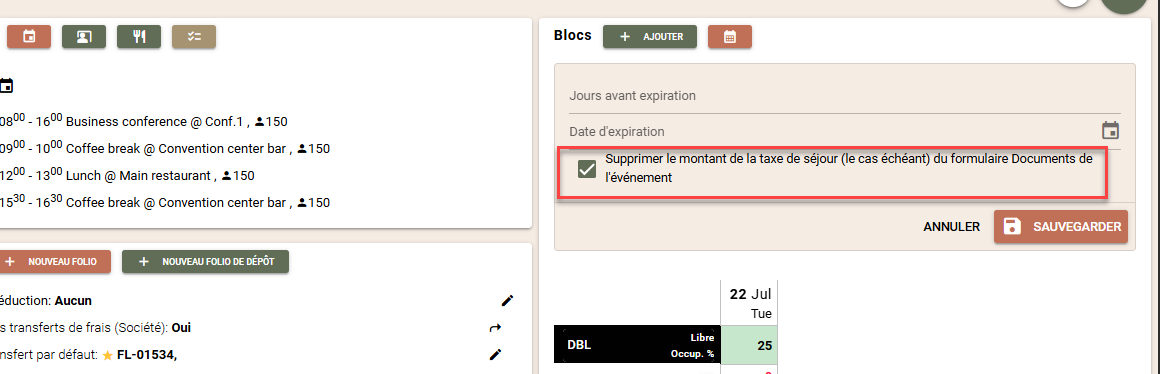Si vous l'activez, le prix du bloc dans la BEO (offre d'événement) n'inclura pas la taxe de séjour, même si le tarif en comporte une. En même temps, si vous faites une réservation sur ce bloc, il y aura une taxe municipale dans les frais de réservation, et vous ne manquerez donc pas de la collecter. L'option permettant d'exclure les taxes municipales de la BEO fonctionne pour les tarifs dont le mode de taxe municipale est « Supplémentaire et séparé ».