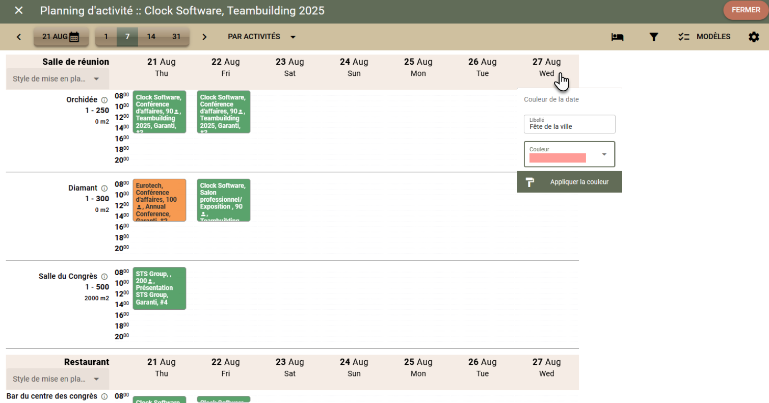 - en cliquant sur l'une des cases, vous ouvrirez le mode 'Par heures' pour cette date, filtré pour la salle de réunion ou le restaurant en question.