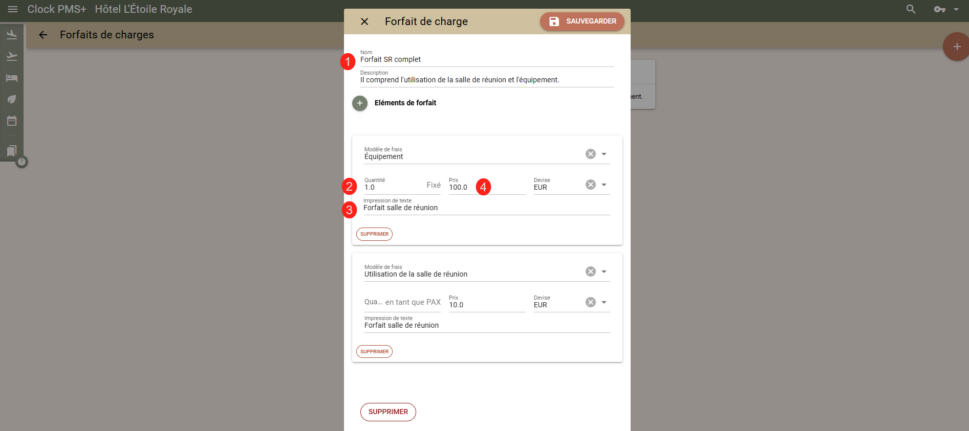 - Si vous laissez le champ vide, la quantité sera ajustée en fonction de chaque utilisation spécifique du forfait. Par exemple, le système proposera par défaut le nombre de participants (PAX) de l'événement, de la réservation de salle de réunion ou du service de restauration, et la quantité sera ajustée en conséquence.