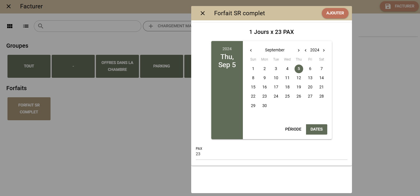 Lors de la saisie d'un forfait, vous devrez indiquer le nombre de PAX (participants) pour chaque frais du forfait si celui-ci est calculé par PAX. Comme d'habitude, vous pouvez choisir la ou les dates auxquelles le forfait doit être appliqué. Si vous publiez un forfait via un Événement ou une Activité, le nombre de PAX de cet événement ou de cette activité sera automatiquement proposé lors de la publication du forfait.