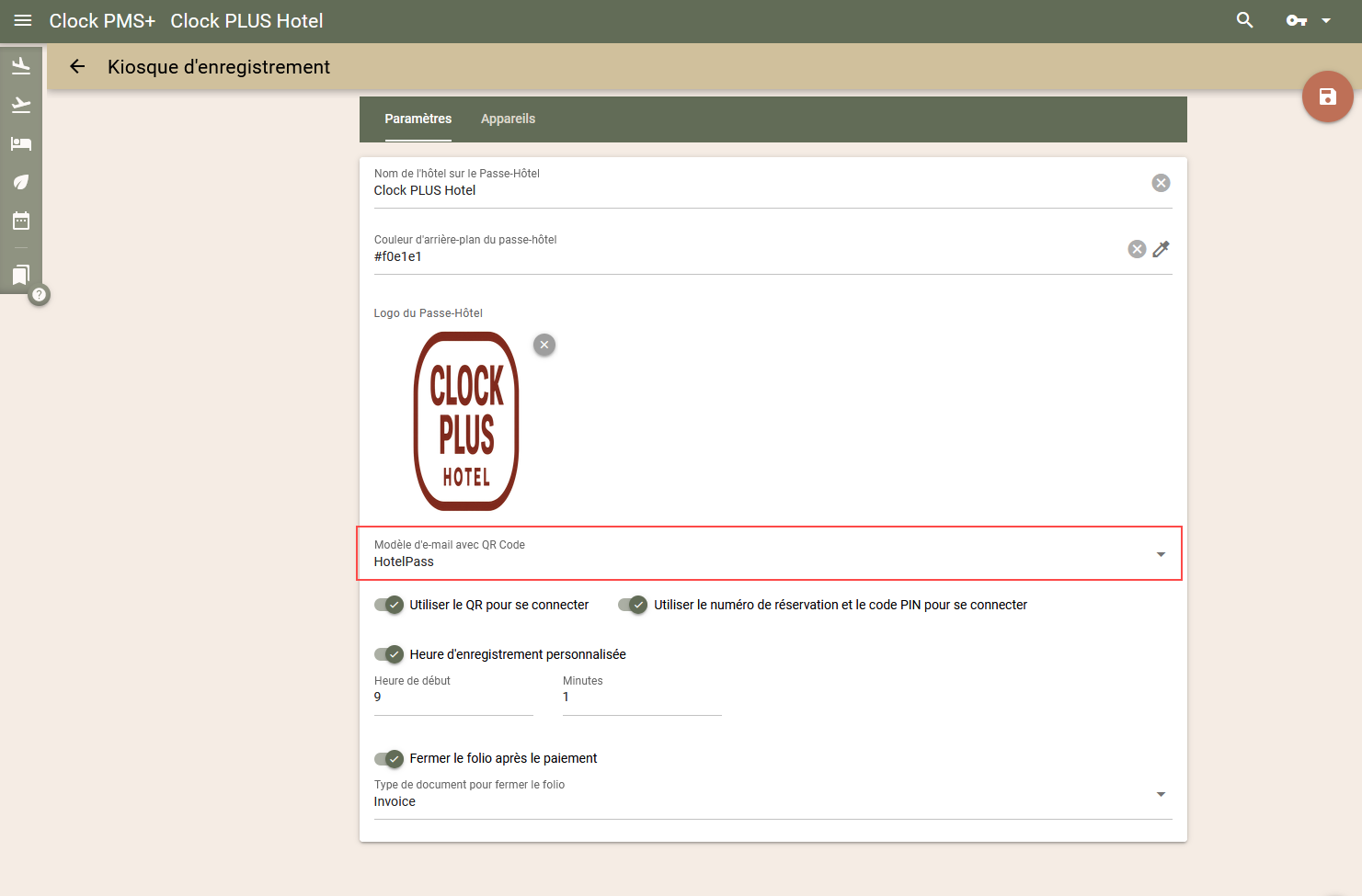 Le Pass Hôtelier est automatiquement envoyé une fois que le client a terminé son enregistrement en ligne. Il existe un modèle par défaut pour l'email du Pass Hôtelier ajouté dans le système. Vous pouvez charger le modèle dans la Messagerie Client si vous souhaitez y appliquer votre propre design et contenu. Ensuite, assurez-vous de sélectionner votre modèle personnalisé dans le menu Paramètres -> Tous les paramètres -> Interaction Client-> Check-in Kiosk -> Paramètres -> Modèle d'email avec QR code.