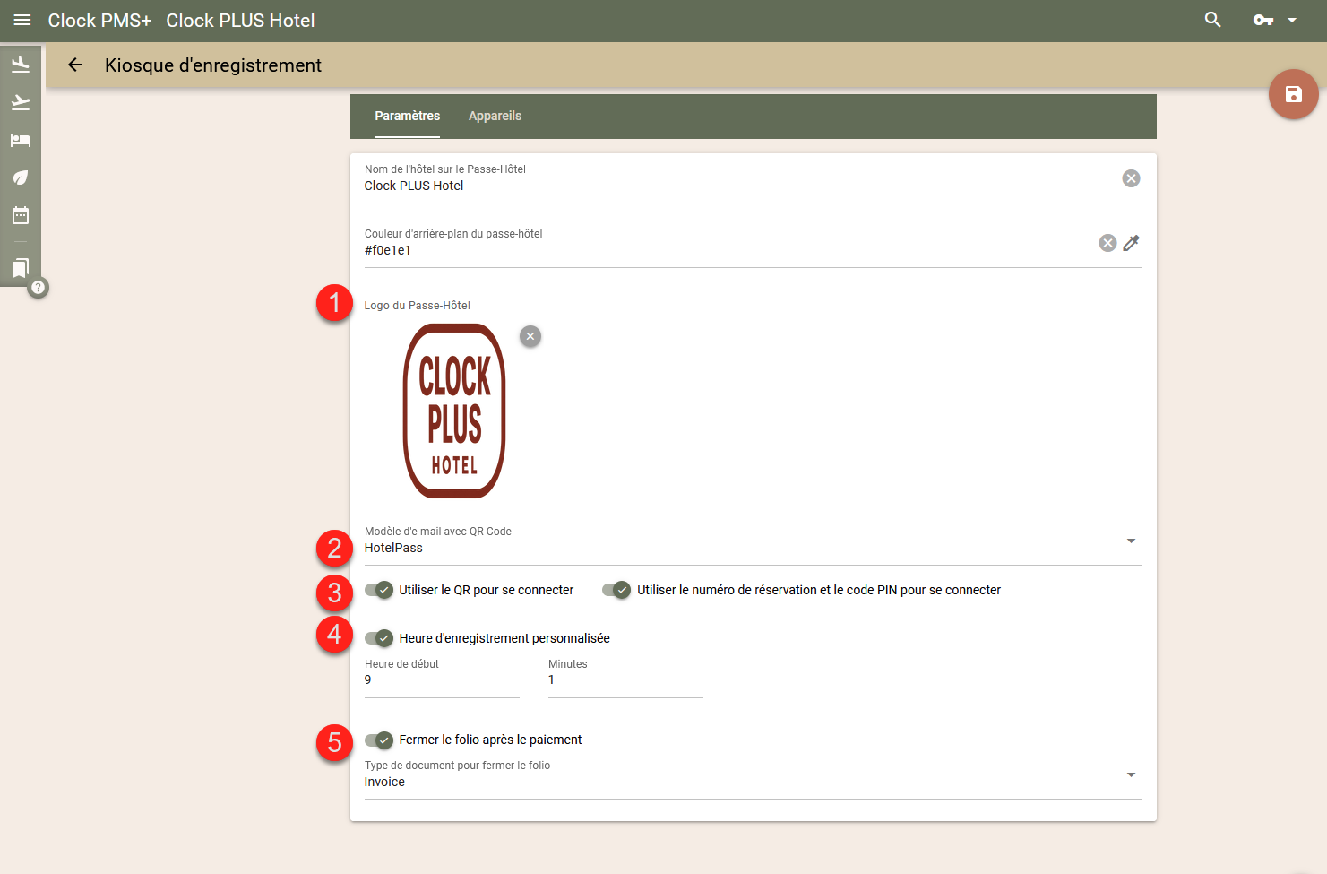 - Nom de l'hôtel sur le Pass Hôtelier; couleur d'arrière-plan du Pass Hôtelier; logo du Pass Hôtelier (1) - ces paramètres contrôlent l'aspect du Pass Hôtelier (QR code) lorsque le client l'ajoute à son Google/Apple Wallet.