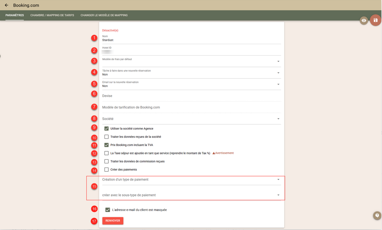 - Créer des paiements (14) - lors de l'importation d'une nouvelle réservation, si le client a payé à l'avance un certain montant, celui-ci sera automatiquement ajouté en tant que paiement au folio de la réservation. Les paramètres « créer avec le type de paiement » et « créer avec le sous-type de paiement »(15)permettent de sélectionner le type et le sous-type des paiements créés automatiquement. А Si vous travaillez avec Booking.com selon un modèle où Booking vous verse les paiements reçus des clients par virement bancaire, cette fonctionnalité peut grandement faciliter votre travail. Notez les spécificités suivantes :
