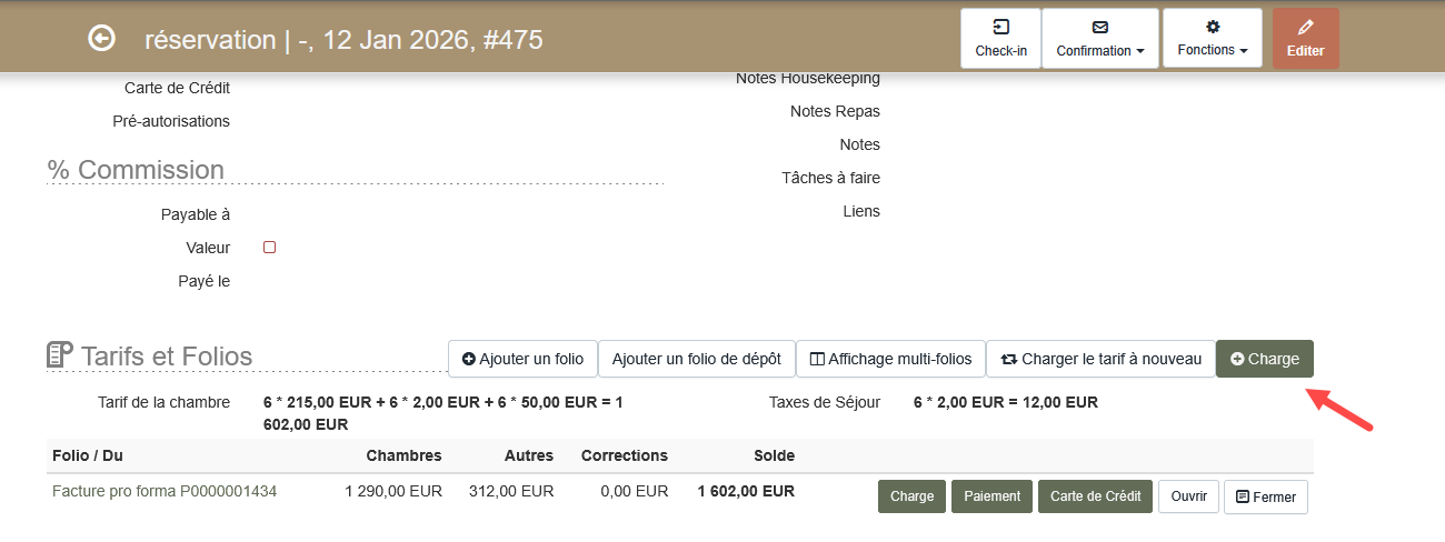 Les frais manuels d'une réservation peuvent également être routés automatiquement. Pour ce faire, vous devez utiliser le bouton "Charge" dans la réservation, dans la section "Tarifs et Folios". Dans ce cas, les frais suivront les règles configurées pour le routage automatique.