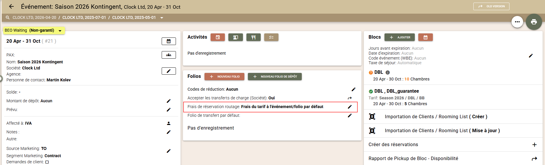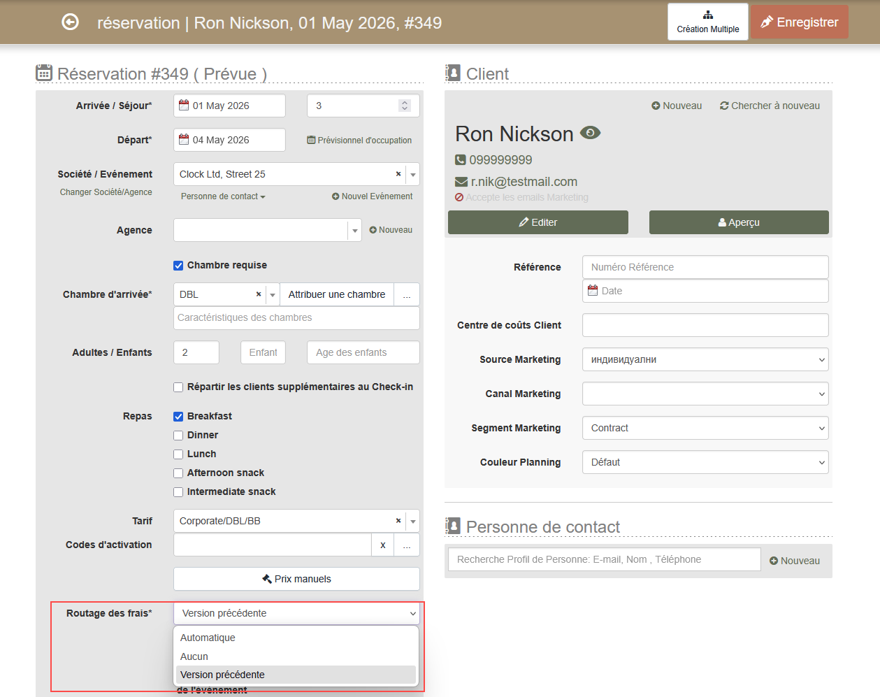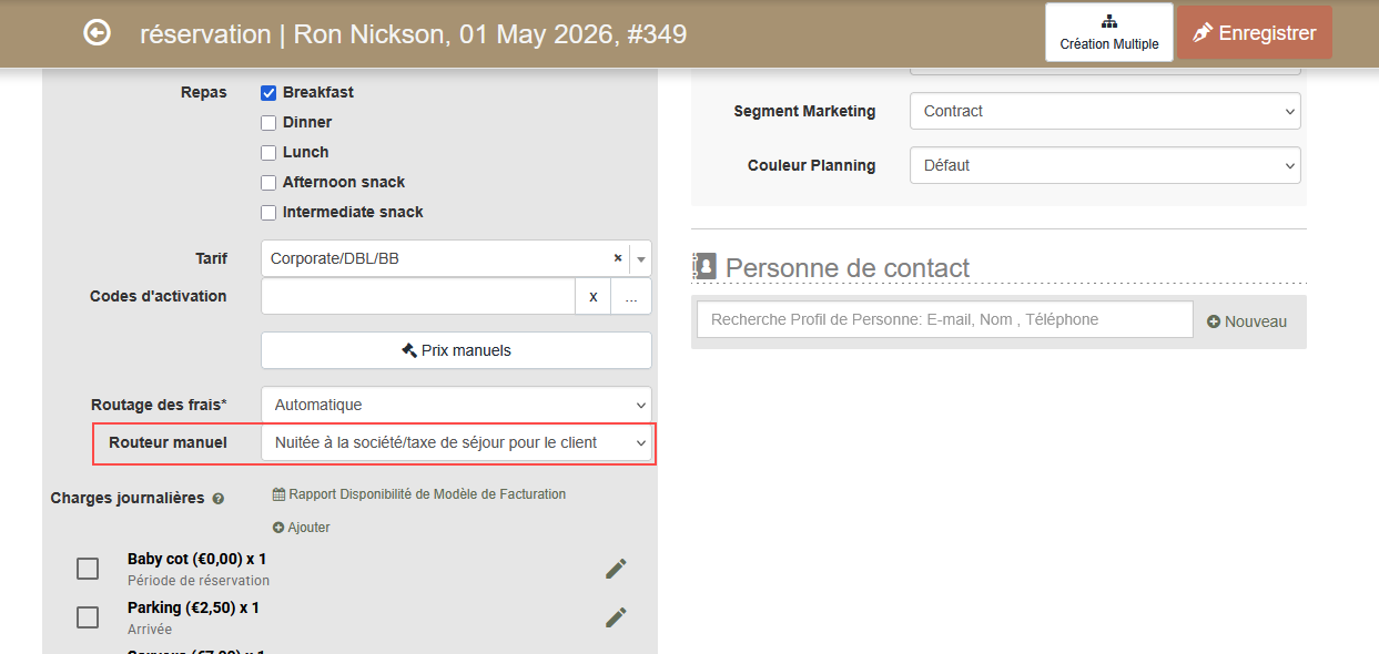 Dans la réservation, le routage des frais est géré via le champ "Routage des frais".